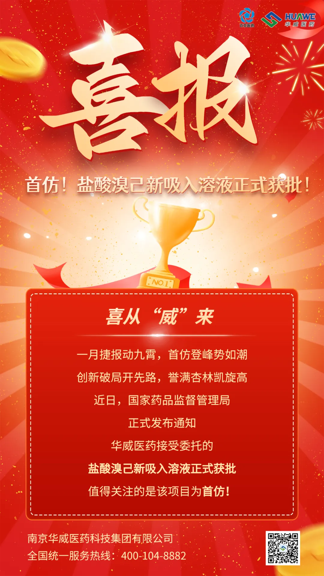 首仿!近日,始終堅持致力創新、求真務實的南京華威醫藥科技集團有限公司再添豐碩成果!國家藥品監督管理局(NMPA)正式發布通知,華威醫藥接受委托的鹽酸溴己新吸入溶液項目正式獲批!